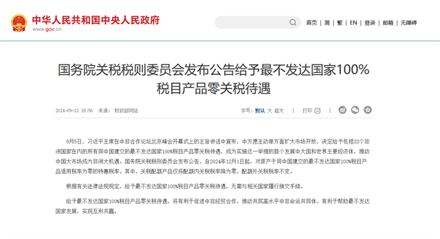 根據《國務院關稅稅則委員會關于給予最不發達國家100%稅目產品零關稅待遇的公告》(稅委會公告2024年第9號),