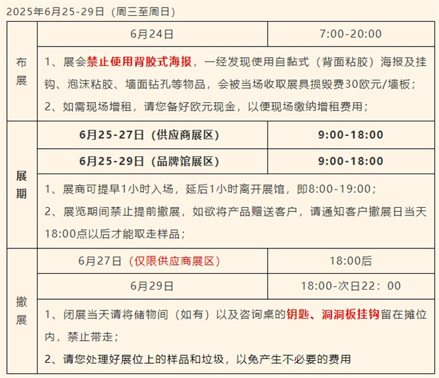 3、嚴(yán)禁在展具、墻面或柱子鉆孔或張貼海報(bào)。自帶海報(bào)需懸掛展示,禁止使用背膠式海報(bào)。違規(guī)者(如使用自粘海報(bào)、掛鉤、泡沫膠或鉆孔)將按 30歐元/米 收取展具損毀費(fèi)(現(xiàn)金支付)。